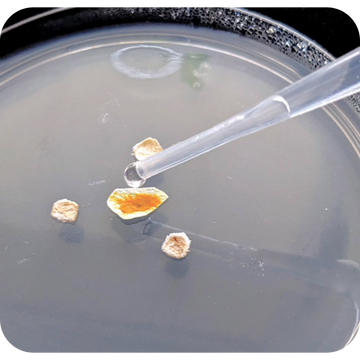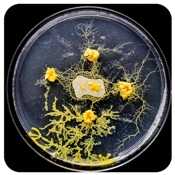 La souche Badhamia : De couleur orangée, ce blob va se réveiller en quelques heures seulement ! Ses déplacements se font en auréoles, sa croissance est spectaculaire, et il ne mettra que 2 ou 3 jours pour coloniser entièrement sa boîte de Petri.