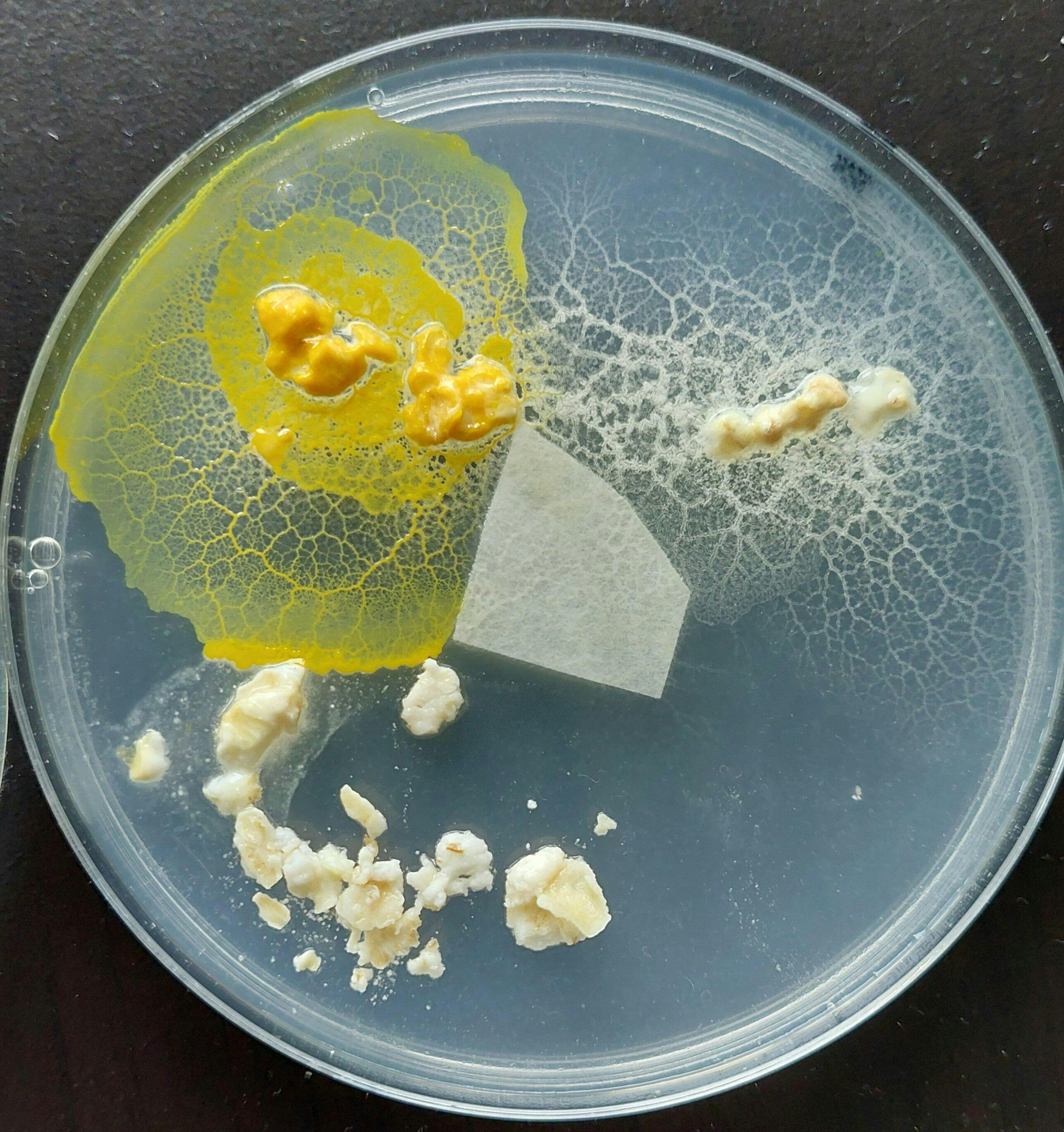Faites à présent chauffer de l'eau et l'agar-agar fournis dans notre coffret, puis disposez votre blob au milieu de la boîte de pétri sur la gélose avec quelques flocons d'avoine et un peu d'eau.
